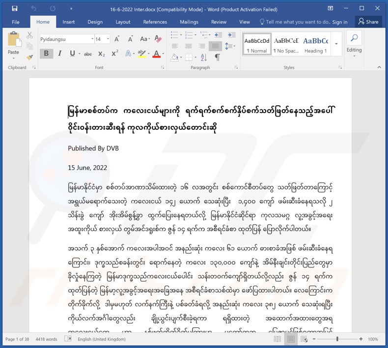 The malware was delivered through email spam campaigns. The emails were typically in Burmese and included Google Drive or Dropbox links leading to archive files containing malicious documents and/or other virulent files. The emails/documents dealt with a variety of topics, e.g., relating to the targeted sphere, global news, geopolitics, controversies, and in some instances - adult-oriented content (pornography).