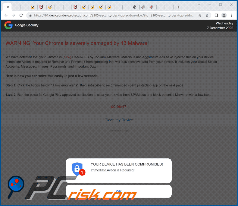 Once visited, deviceunder-protection[.]com displays a pop-up message claiming that a device has been compromised and immediate action is required. The "warning" in the background says that Google Security has detected that the Chrome browser is damaged by malware. It also states that malicious ads have infected a device.