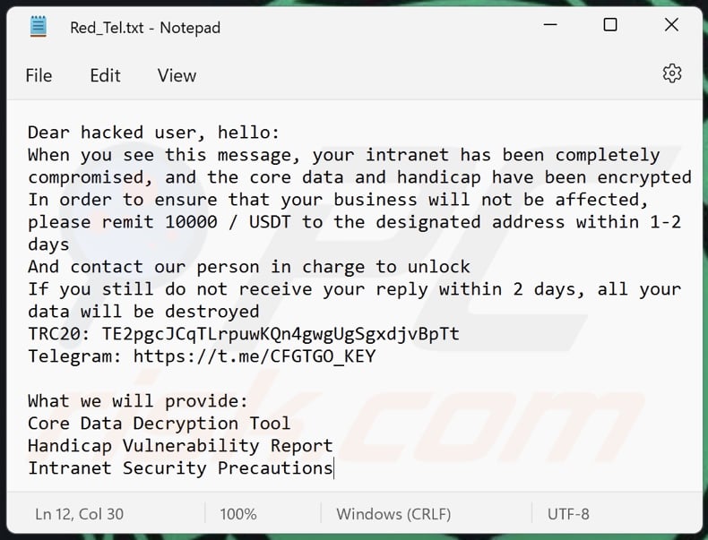 Screenshot of Teng Snake ransomware's text file ("Red_Tel.txt"):
