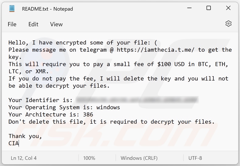 The text presented in the ransom note is nearly identical in both versions of CIA ransomware. The desktop wallpapers instruct victims to check out the created text files. Said messages state that the victims' data was encrypted. Recovering it necessitates paying a ransom worth 100 USD in BTC (Bitcoin), ETH (Ethereum), LTC (Litecoin), or XMR (Monero) cryptocurrencies.