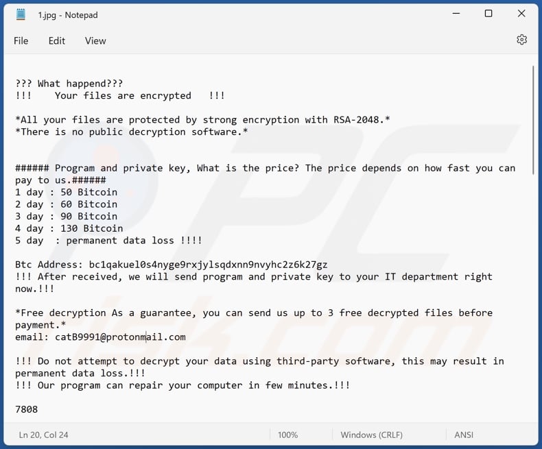 The size of the ransom will depend on how quickly the payment is made. The first day will cost 50 BTC (Bitcoin cryptocurrency), while paying on the fourth will be 130 BTC. At the time of writing, these sums were worth approximately 800 thousand USD and 2 million USD (note that exchange rates constantly fluctuate). After the ransom is paid, the notes claim that the victims' IT department will receive the decryption keys.