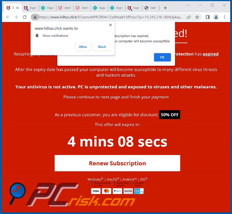 We found that hiltus[.]click runs the "McAfee Total Protection has expired" and "McAfee - Your Card Payment Has Failed!", and possibly other scams. It displays fake messages to trick visitors into purchasing legitimate antivirus software. Pages that use deceptive marketing to promote software should never be trusted, even if the promoted software is legitimate.