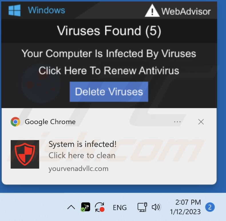 Notifications from yourvenadvllc[.]com claim that a computer is infected, encourage to remove annoying pop-ups, offer to discover new and used local car deals, etc. Clicking them can open phishing websites, technical support scam pages, websites promoting untrustworthy apps, etc., and even malicious sites.