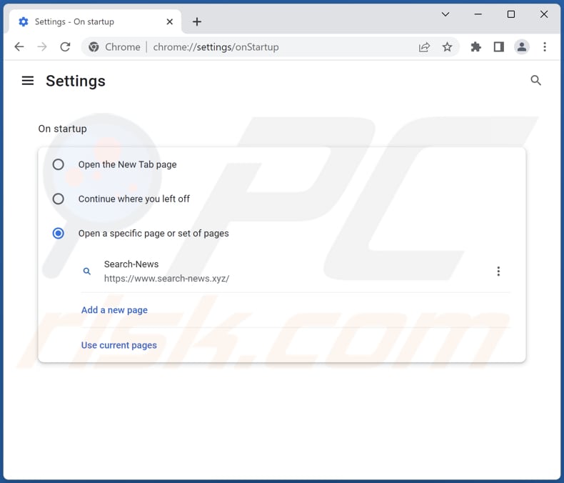 (at the top right corner of Google Chrome), select "Settings". In the "On startup" section, disable "Search-News Default Search", look for a browser hijacker URL (hxxp://www.search-news.xyz) below the "Open a specific or set of pages" option. If present click on the three vertical dots icon and select "Remove".