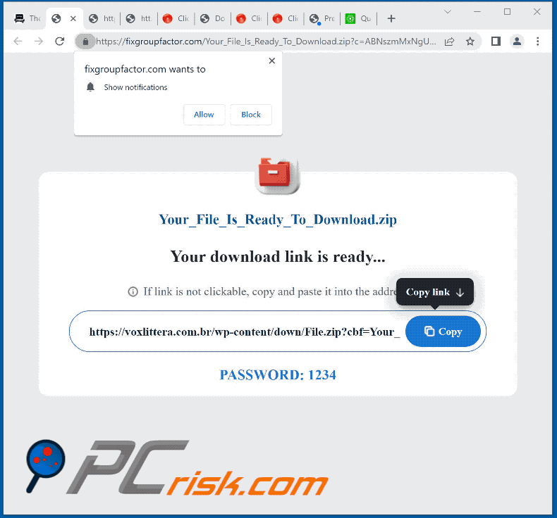When we inspected fixgroupfactor[.]com, it presented us with a false statement – "Your download link is ready...", and instructed to click and open the link. After we pressed it, we were redirected to a website hosting malware. Rogue pages are known to push a variety of untrustworthy, harmful, and malicious software – adware, browser hijackers, fake anti-viruses, PUAs, trojans, ransomware, and so on.