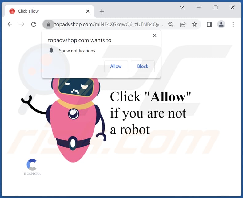 Topadvshop[.]com displays a fake message claiming that it is required to pass a CAPTCHA by clicking the "Allow" button (to prove that visitors are not robots). In reality, it wants to display shady notifications. We found that notifications from topadvshop[.]com are fake virus warnings/alerts, investment offers, and other fake messages.