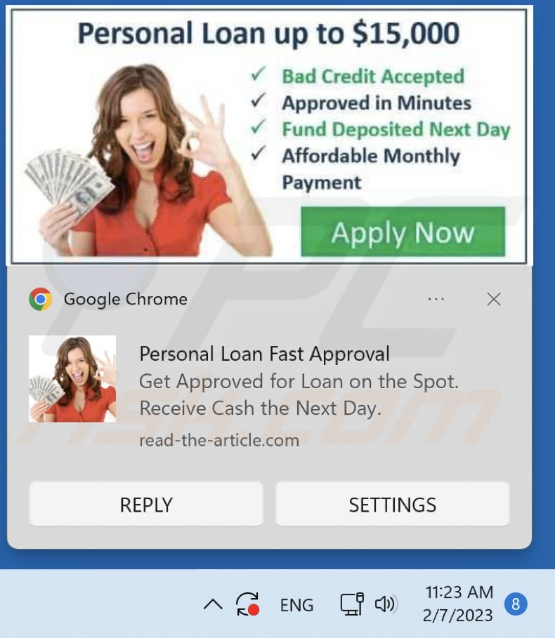 Notifications displayed by read-the-article[.]com lure users with promises of viewing leaked videos of celebrities, obtaining quick loans, checking some unread messages, playing audio messages, scanning their computer for malware, etc. These notifications can open potentially malicious websites.