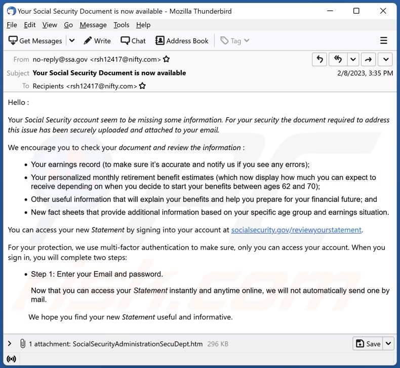 | Fake Claim | Recipient's social security account is missing data, and they must review the attached documentation. |