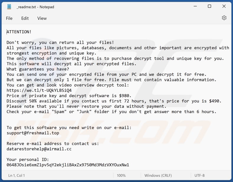 After examining the ransom note, we discovered that its purpose is to furnish details for making contact and partial payment. Inside the "_readme.txt" file, there are two email addresses - support@freshmail.top and datarestorehelp@airmail.cc - and two different amounts of money required for the ransom - $980 and $490.