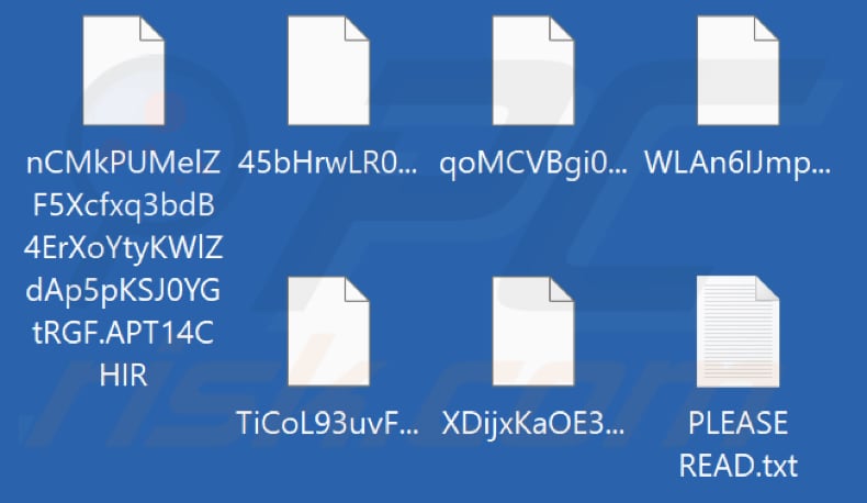APT14CHIR is ransomware that our team discovered while examining samples submitted to the VirusTotal website. The purpose of APT14CHIR is to encrypt files. Additionally, it creates a ransom note ("PLEASE READ.txt" file) and renames files by replacing their filenames with a string of random characters and appending the ".APT14CHIR" extension.