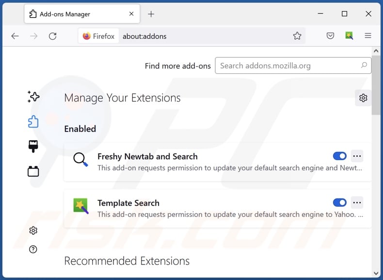 (at the top right corner of the main window), select "Add-ons and themes". Click "Extensions", in the opened window locate all recently-installed suspicious extensions, click on the three dots and then click "Remove".