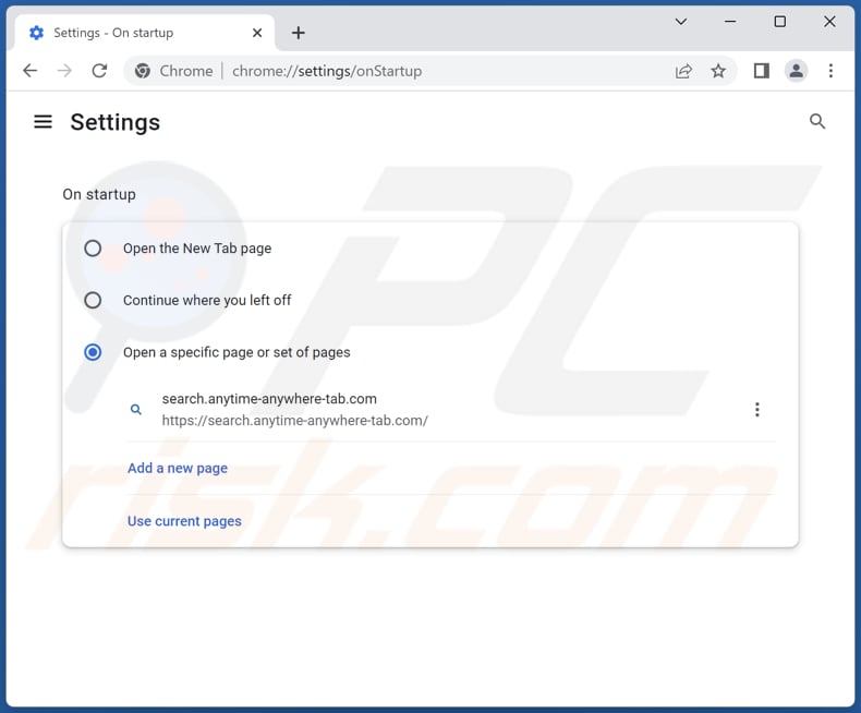 (at the top right corner of Google Chrome), select "Settings". In the "On startup" section, disable the malicious extension (if present), look for a browser hijacker URL (hxxp://www.search.anytime-anywhere-tab.com) below the "Open a specific or set of pages" option. If present click on the three vertical dots icon and select "Remove".