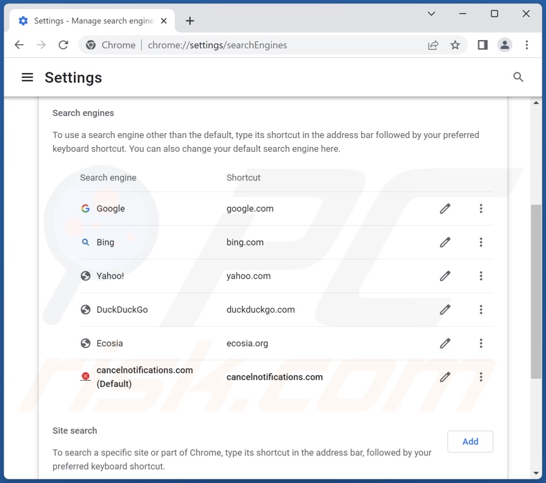 Illegitimate search engines usually cannot generate search results, so they redirect to genuine ones. At the time of research, cancelnotifications.com redirected to the Bing search engine (bing.com). However, it must be noted that this site could lead elsewhere since redirects can depend on various factors (e.g., user geolocation).