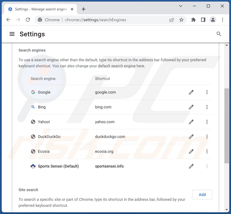 (at the top right corner of Google Chrome), select "Settings", in the "Search engine" section, click "Manage search engines...", in the opened list look for "sportsensei.info", when located click the three vertical dots near this URL and select "Delete".