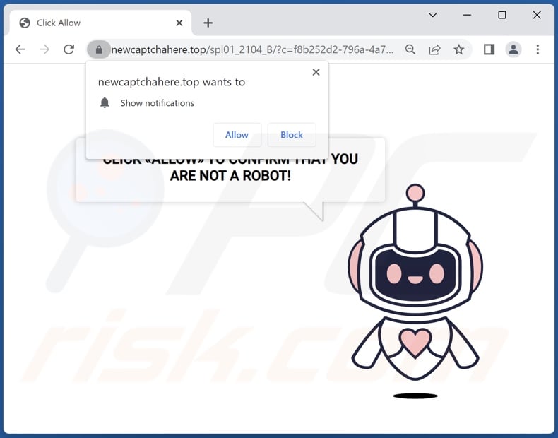 Our research team discovered the newcaptchahere[.]top rogue page while investigating dubious websites. It is designed to promote browser notification spam and redirect users to other (likely unreliable/hazardous) sites.