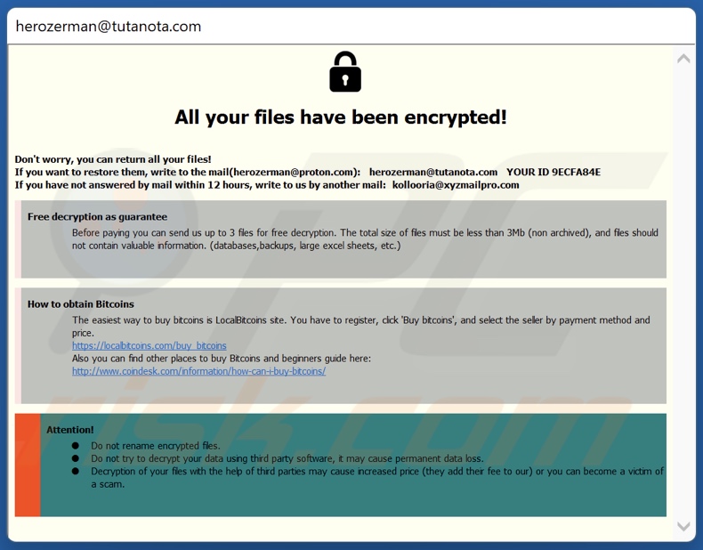 On our testing system, H3r renamed the encrypted files by appending their titles with a unique ID assigned to the victim, the cyber criminals' email address, and a ".h3r" extension. For example, a file originally named "1.jpg" appeared as "1.jpg.id-9ECFA84E.[herozerman@tutanota.com].h3r". Afterwards, H3r ransomware displayed/created a ransom note in a pop-up window and a text file titled "info.txt".