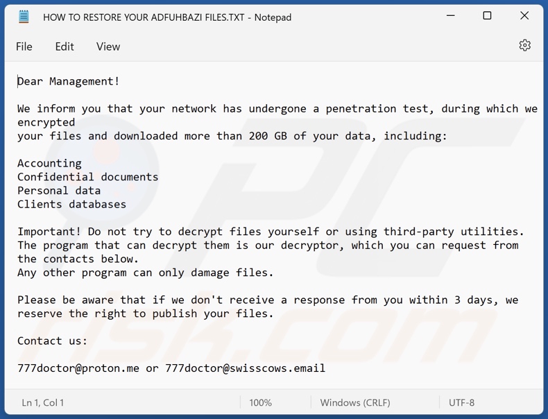 | Cyber Criminal Contact | 777doctor@proton.me, 777doctor@swisscows.email |