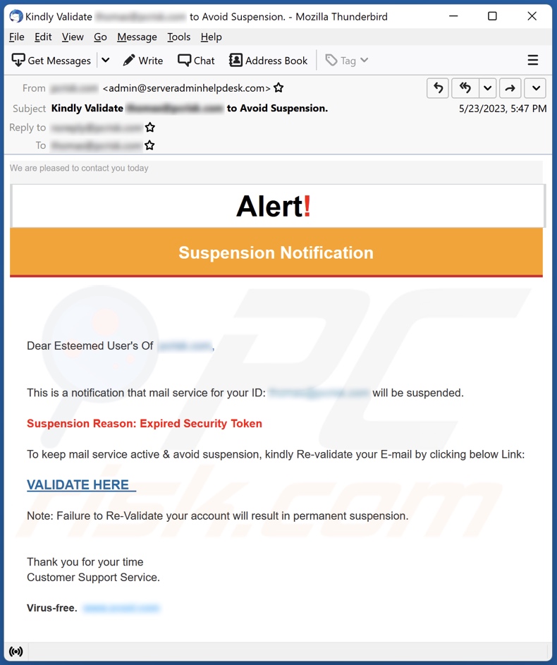 The spam email with the subject "Kindly Validate [recipient's_email_address] to Avoid Suspension." (may vary) informs that due to an expired security token – the email account will be suspended. The recipient is instructed to re-validate their account to prevent permanent suspension. It must be stressed that this letter is fake, and it is in no way associated with any genuine entities or service providers.