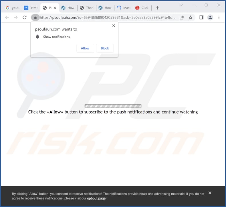 Psoufauh[.]com presents a message that urges visitors to click the "Allow" button in order to subscribe to push notifications and proceed with watching its content. This implies that access to the website's content is contingent upon granting permission for notifications.