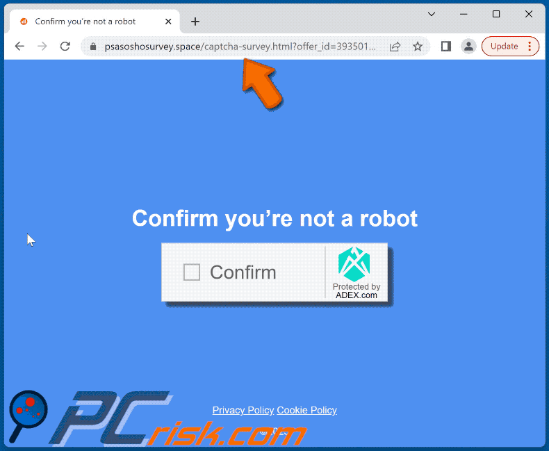 Psasoshosurvey[.]space implies that visitors must confirm that they are not robots to access the page content. Also, a browser informs visitors that psasoshosurvey[.]space wants to show notifications. Interacting with the "Confirm" checkbox presented on psasoshosurvey[.]space leads to ptilselr[.]com.
