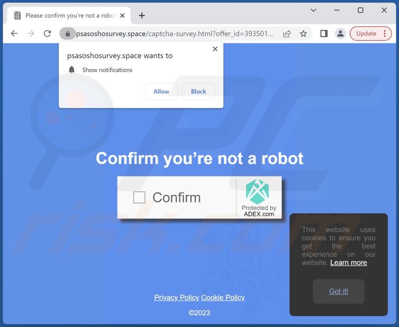 During our examination, we learned that psasoshosurvey[.]space is a dubious website designed to lure visitors into permitting it to send notifications. Psasoshosurvey[.]space displays deceptive content to receive that permission. Also, psasoshosurvey[.]space redirects visitors to other (similar) websites.