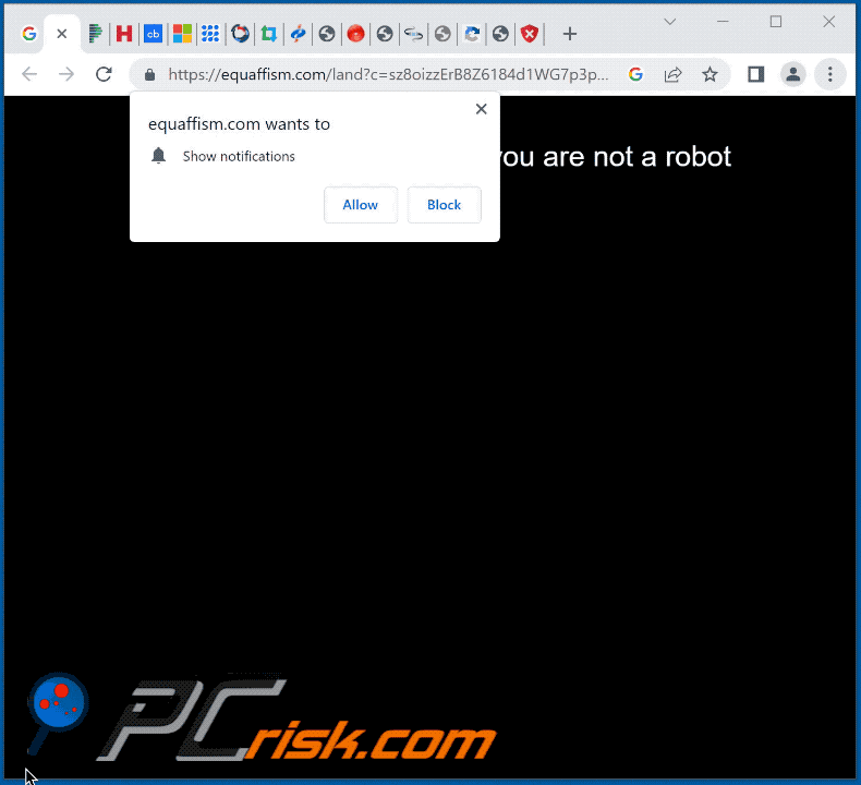 During our examination of equaffism[.]com, we found that this is an untrustworthy page designed to trick visitors into agreeing to receive notifications. The page displays a misleading message as a lure. Also, equaffism[.]com redirects visitors to other websites that may be malicious. Thus, equaffism[.]com cannot be trusted.