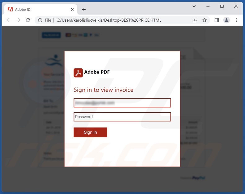 As mentioned in the introduction, all the claims made by this spam letter are fake. Hence, the email's attachment ("BEST PRICE.HTML") is a phishing file that asks the user to sign in with their mail account to view the "invoice". Information entered into such files is recorded and sent to cyber criminals.