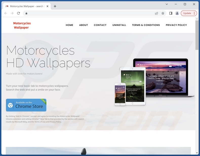 We obtained Motorcycles Wallpaper from its "official" promotional page. In addition to such webpages, browser hijackers are commonly endorsed on scam sites. Users primarily access these pages via redirects caused by websites employing rogue advertising networks, misspelled URLs, intrusive ads, spam browser notifications, or installed adware.