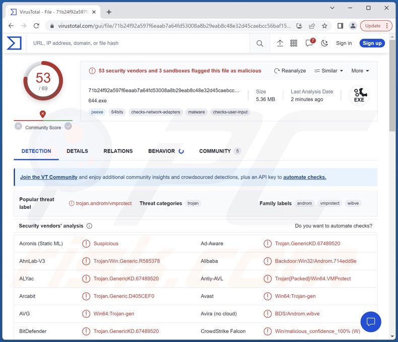 | Detection Names | Avast (Win64:Trojan-gen), Combo Cleaner (Trojan.GenericKD.67489520), ESET-NOD32 (A Variant Of Win64/Packed.VMProtect.HH), Kaspersky (Backdoor.Win32.Androm.vhkv), Microsoft (Trojan:Win32/Malagent!MSR), Full List Of Detections (VirusTotal) |