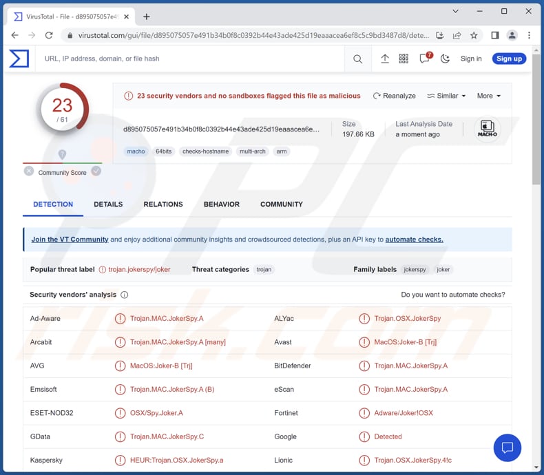 | Detection Names | Avast (MacOS:Joker-B [Trj]), Combo Cleaner (Trojan.MAC.JokerSpy.A), ESET-NOD32 (OSX/Spy.Joker.A), Kaspersky (HEUR:Trojan.OSX.JokerSpy.a), Sophos (OSX/JokerSpy-A), Full List (VirusTotal) |