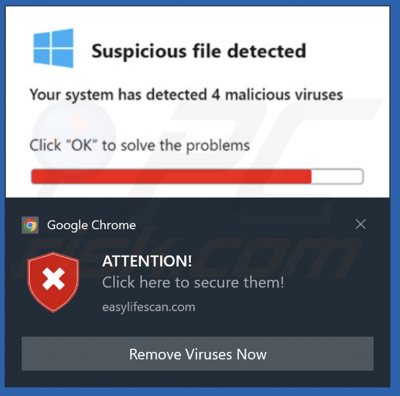 When we visited easylifescan[.]com, it presented us with a bogus anti-virus interface. It then performed a fake system scan, during which countless threats were "detected". Typically, deceptive content of this kind is used to push untrustworthy/harmful software. More information on this scheme can be found in our article on the "You've visited illegal infected website" scam.