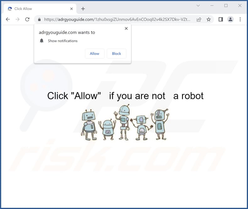 When we visited adrgyouguide[.]com, it presented us with a bogus CAPTCHA verification test. To elaborate, the page displayed an image depicting robots, and above it were instructions to – "Click 'Allow' if you are not a robot".