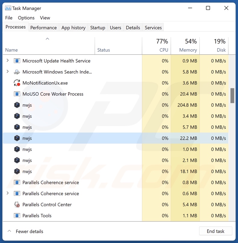 Screenshot of Subtitles adware's process on Windows Task Manager ("nwjs" process name):