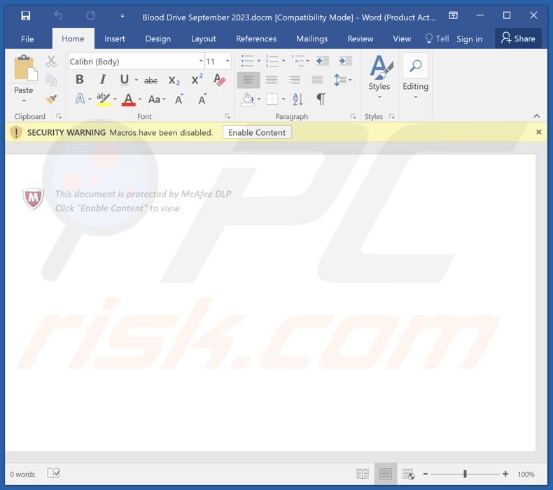 AtlasAgent likely infiltrated your computer through a deceptive email attachment. The attackers used a decoy document named "Blood Drive September 2023.docm," ostensibly related to a United States Red Cross blood donation event. When you opened this document, it prompted you to enable macros, and if you complied, the document revealed its hidden content and injected AtlasAgent into your computer.