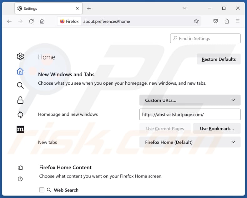 - STEP 3. Remove abstractstartpage.com homepage and default search engine from Mozilla Firefox.