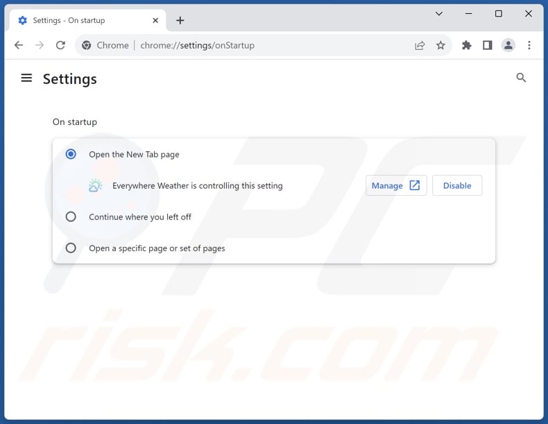 (at the top right corner of Google Chrome), select "Settings". In the "On startup" section, disable "Everywhere Weather", look for a browser hijacker URL (hxxp://www.goog.everywhere-weather.com) below the "Open a specific or set of pages" option. If present click on the three vertical dots icon and select "Remove".