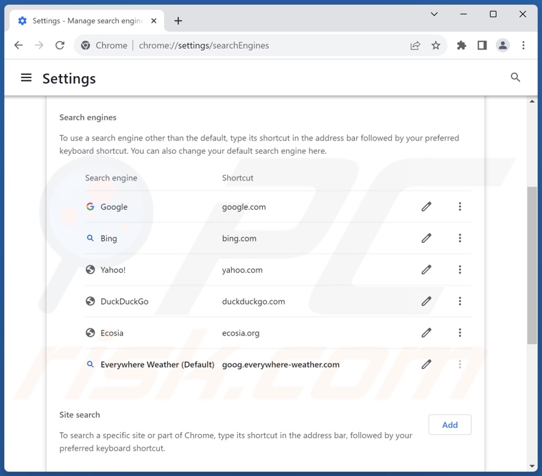 Illegitimate search engines usually cannot generate search results, so they redirect to genuine Internet search websites. At the time of research, goog.everywhere-weather.com redirected to the Bing search engine (bing.com). Note that it could lead elsewhere, as factors like user geolocation may impact redirects.