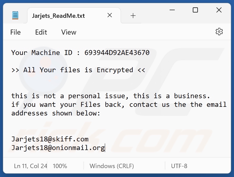 Jarjets' text file merely informs the victim that their files have been encrypted and urges them to contact the cyber criminals.