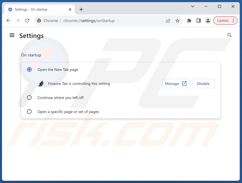(at the top right corner of Google Chrome), select "Settings". In the "On startup" section, disable "Finance Tab", look for a browser hijacker URL (hxxp://www.financetab.com) below the "Open a specific or set of pages" option. If present click on the three vertical dots icon and select "Remove".