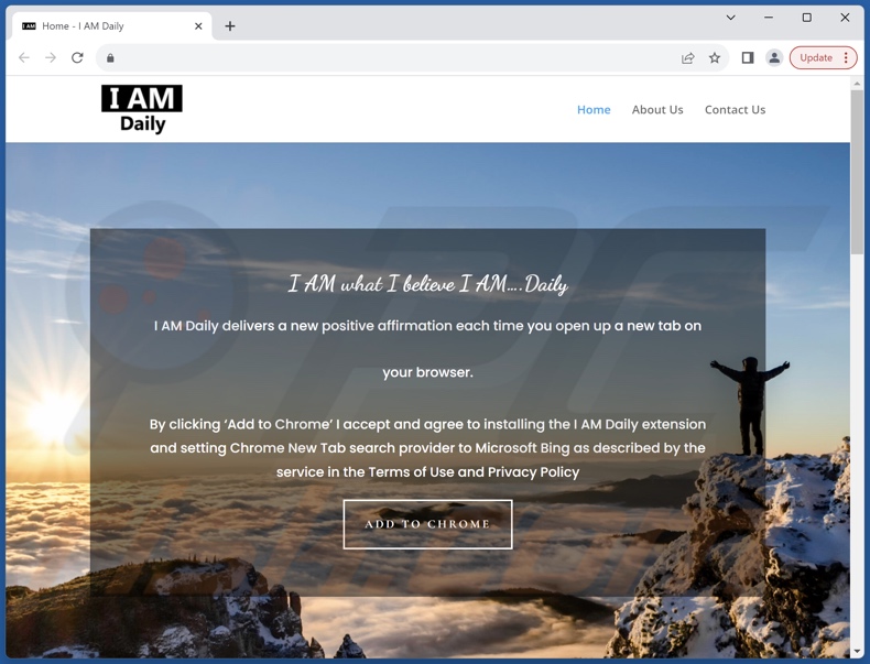 I AM Daily is a rogue extension that promises to provide "positive affirmation" to users whenever they open a new browser tab. This piece of software makes modifications to browser settings in order to generate redirects. Due to this behavior, I AM Daily is categorized as a browser hijacker.