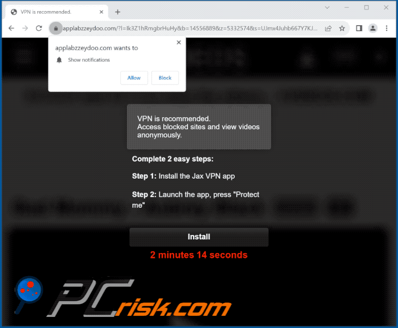 Our researchers discovered the applabzzeydoo[.]com rogue webpage while inspecting untrustworthy sites. It is designed to promote deceptive content and spam browser notifications. Additionally, this page can redirect users elsewhere (likely unreliable/hazardous) websites.