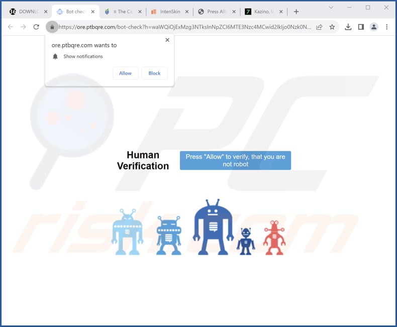 Ptbqre[.]com showcases an image of robots accompanied by a misleading message, asserting that visitors must click the "Allow" button to verify their non-robot status. Ptbqre[.]com implies that taking this action will successfully pass a CAPTCHA and grant visitors access to the content on the page.
