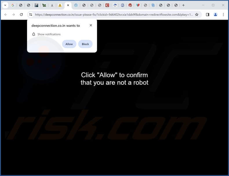 After a thorough examination, we have determined that deepconnection.co[.]in is a deceptive website employing clickbait tactics to deceive visitors into granting permission for notifications. Typically, users stumble upon websites like deepconnection.co[.]in unintentionally.