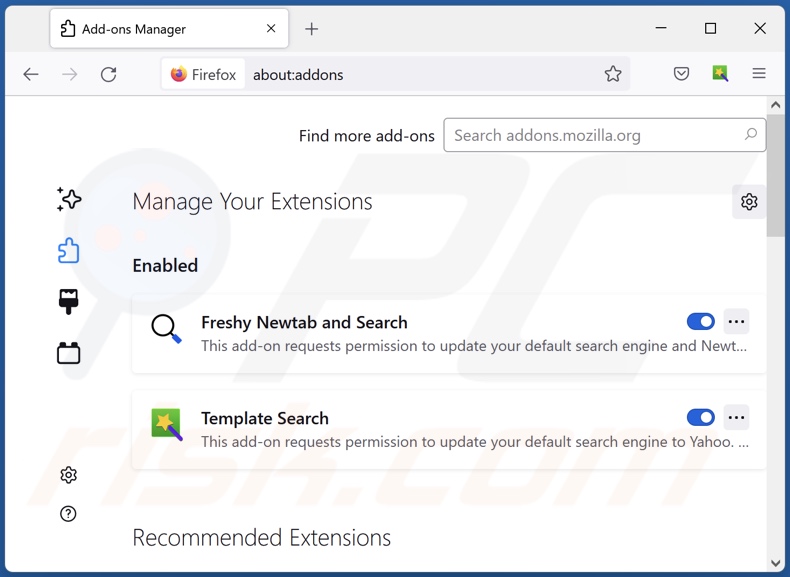 (at the top right corner of the main window), select "Add-ons and themes". Click "Extensions", in the opened window locate all recently-installed suspicious extensions, click on the three dots and then click "Remove".