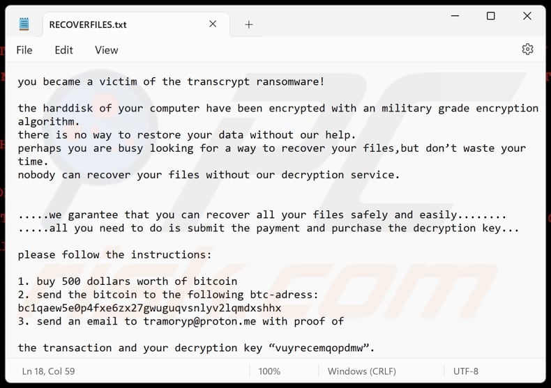 The ransom note guarantees the safe and easy recovery of all files upon payment. It provides specific instructions for the victim, including purchasing $500 worth of bitcoin and sending it to a specified address. Additionally, the victim is instructed to email proof of the transaction along with their decryption key to tramoryp@proton.me.
