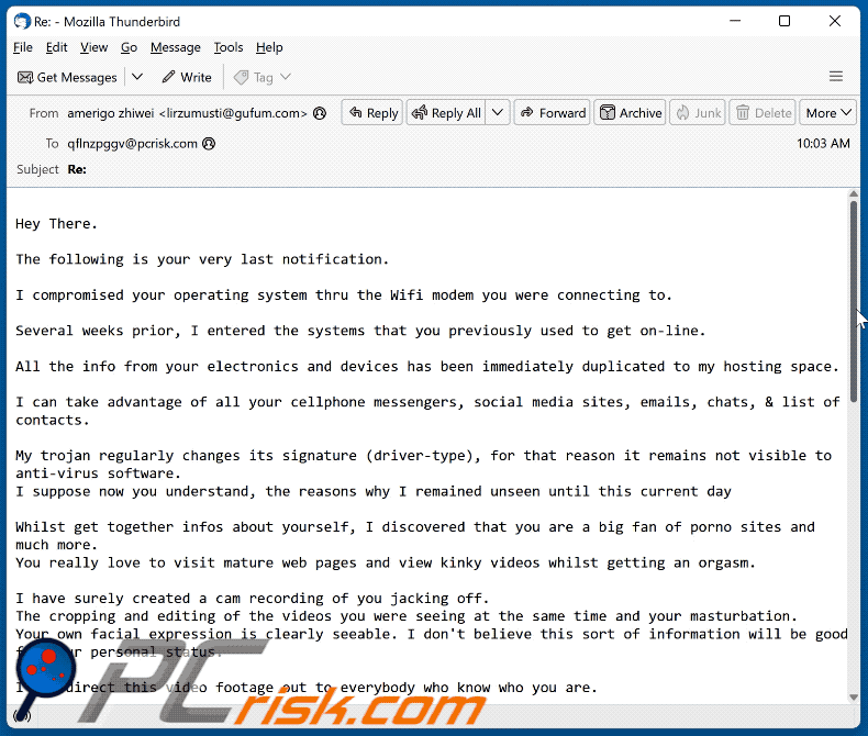 Furthermore, the sender alleges to have utilized the infected device's camera to record the user when they were visiting websites that host pornographic content. The footage was spliced into a video showing the recipient and the content they were viewing.