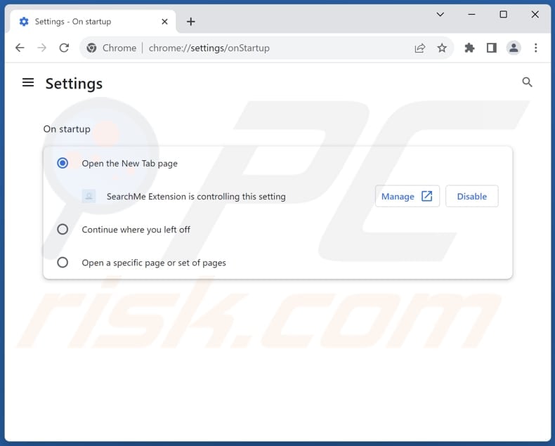 (at the top right corner of Google Chrome), select "Settings". In the "On startup" section, disable "SearchMe Extension", look for a browser hijacker URL (hxxp://www.search-me-ext.com) below the "Open a specific or set of pages" option. If present click on the three vertical dots icon and select "Remove".