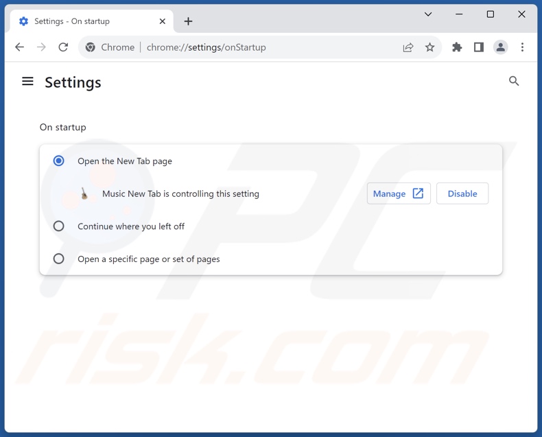 (at the top right corner of Google Chrome), select "Settings". In the "On startup" section, disable "Music New Tab", look for a browser hijacker URL (hxxp://www.music-newtab.com) below the "Open a specific or set of pages" option. If present click on the three vertical dots icon and select "Remove".