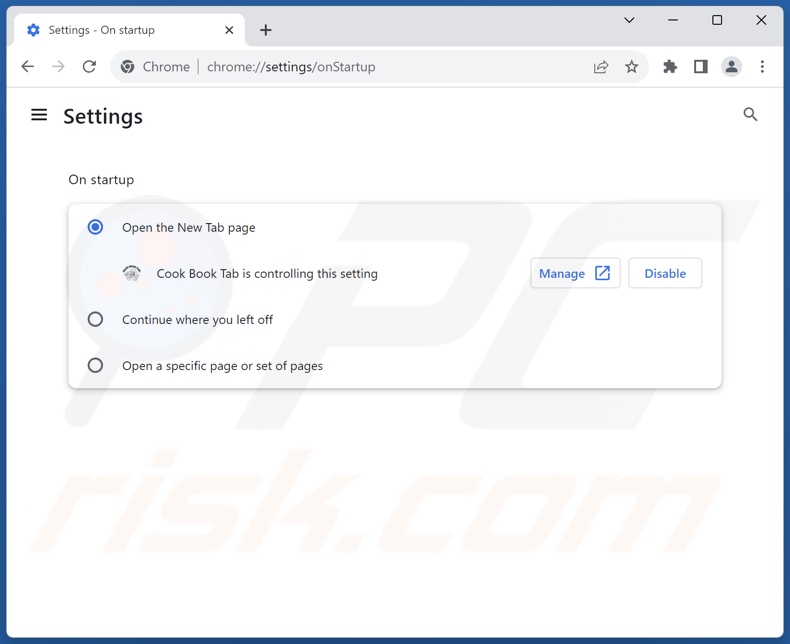 (at the top right corner of Google Chrome), select "Settings". In the "On startup" section, disable "Cook Book Tab", look for a browser hijacker URL (hxxp://www.cookbooktab.com) below the "Open a specific or set of pages" option. If present click on the three vertical dots icon and select "Remove".
