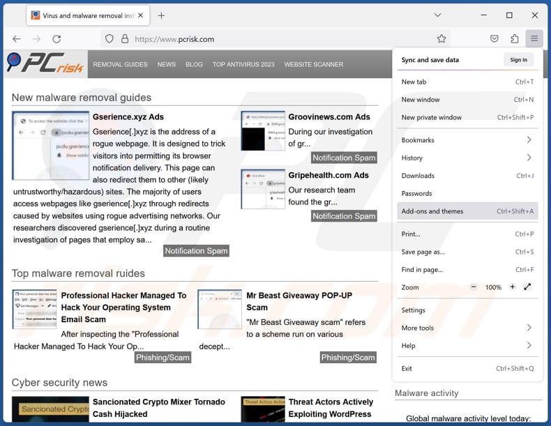 (at the top right corner of the main window), select "Add-ons and themes". Click "Extensions", in the opened window locate all recently-installed suspicious extensions, click on the three dots and then click "Remove".